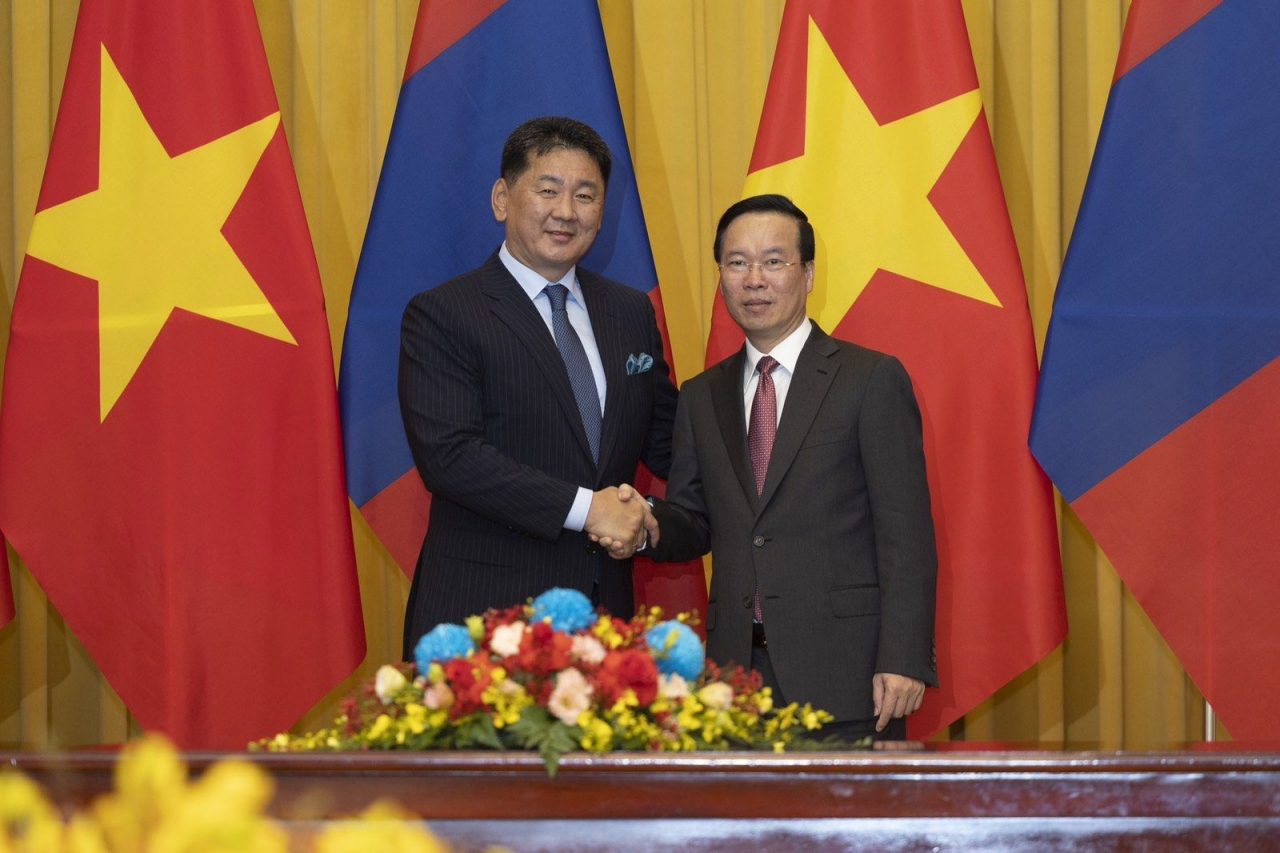 Монгол Улсын Ерөнхийлөгчийн Бүгд Найрамдах Социалист Вьетнам Улсад хийж буй төрийн айлчлалын хүрээнд Монгол Улсын Ерөнхийлөгч У.Хүрэлсүх, БНСВУ-ын Ерөнхийлөгч Во Ван Тыөнг нарыг байлцуулан хоёр улсын харилцаа, хамтын ажиллагааны баримт бичигт гарын үсэг зурах ёслол боллоо.