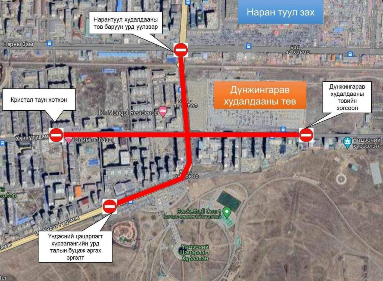 - Нарантуул худалдааны төв баруун урд уулзвар хүрэх чиглэлд замуудыг 200-500 орчим метрийн зайд хязгаарлалт хийж, түр хугацаагаар хаагаад байгаа юм.