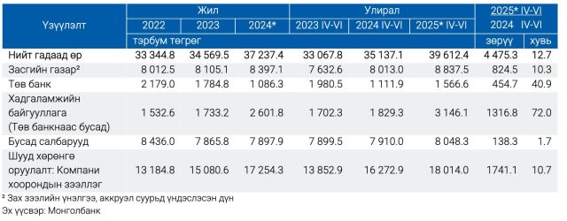 Улсын нийт гадаад өр 2025 оны 2 дугаар улиралд өмнөх оны мөн үеэс өсөхөд шууд хөрөнгө оруулалт, компани хоорондын зээллэг 1.7 (10.7%) тэрбум ам.доллароор, Төв банкнаас бусад хадгаламжийн байгууллагынх 1.3 (72.0%) тэрбум ам.доллароор, Засгийн газрын гадаад өр 824.5 (10.3%) сая ам.доллароор тус тус өссөн нь нөлөөлсөн байна.