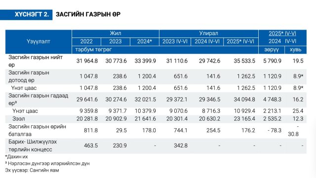 Засгийн газрын гадаад өр 2025 оны 2 дугаар улиралд өмнөх оны мөн үеэс 4.7 (16.2%) их наяд төгрөг, дотоод өр 1.1 (8.9 дахин) их наяд төгрөгөөр тус тус өсжээ. Харин Засгийн газрын өрийн баталгаа 78.3 (30.8%) тэрбум төгрөгөөр буурчээ.