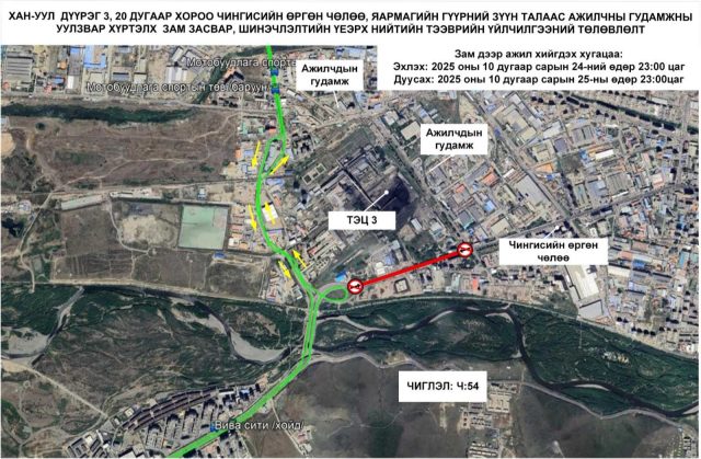 Хан-Уул дүүргийн 3, 20 дугаар хороо Чингисийн өргөн чөлөө, Яармагийн гүүрний зүүн талаас Ажилчны гудамжны уулзвар хүртэлх зам, засвар, шинэчлэлтийн ажил энэ сарын 24-ний 23:00 цагаас эхэлнэ.