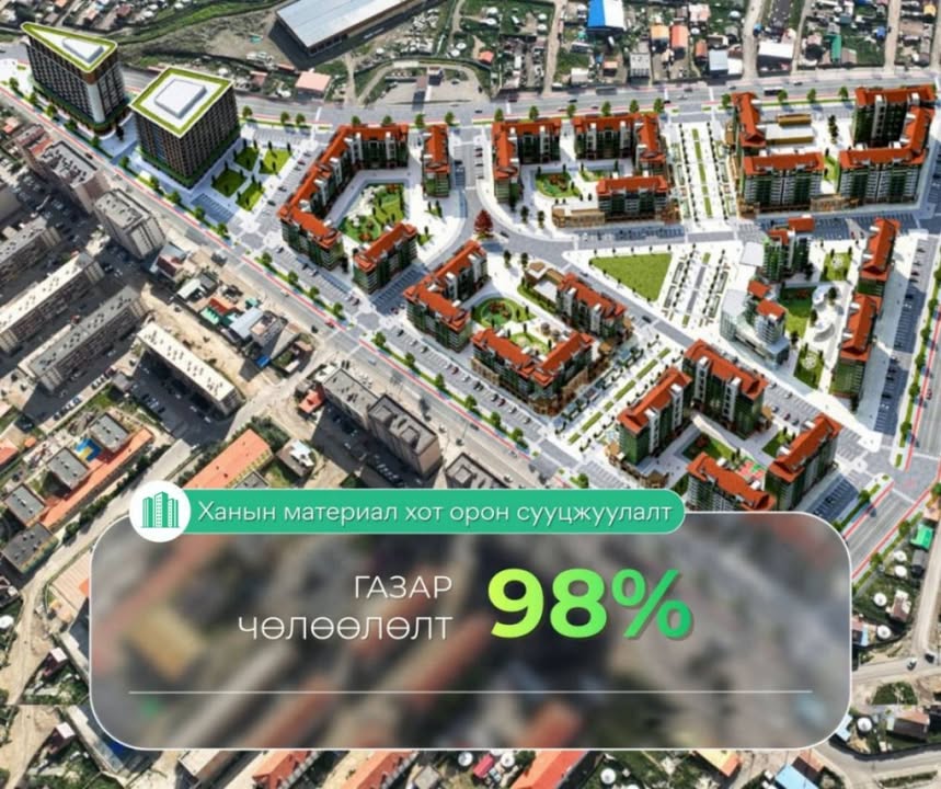Мөн нийт талбайн 60 хувьд нийтийн зориулалттай цэцэрлэгт хүрээлэн, явган хүний болон дугуйн зам, тоглоомын талбай, гэрэлт гудамж, ногоон байгууламжийг цогцоор шийдэх юм.
